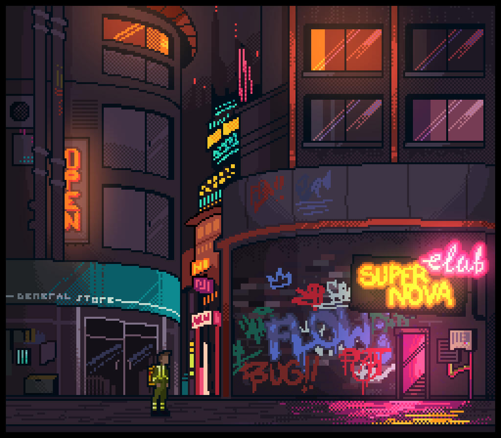 Pixel art background and original sprite, July 2023, digital painting